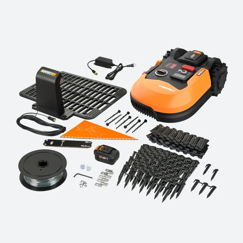 - Includes Landroid L (WR155), 2.0 Ah Power Share battery (WA3669), Charging Station (WA0464), 820 ft. Boundary Wire, (340) Boundary Wire Pegs, (2) Wire Connectors, (8) Base Screws, (9) Blades, (9) Blade Screws, and (1) Hex Key.